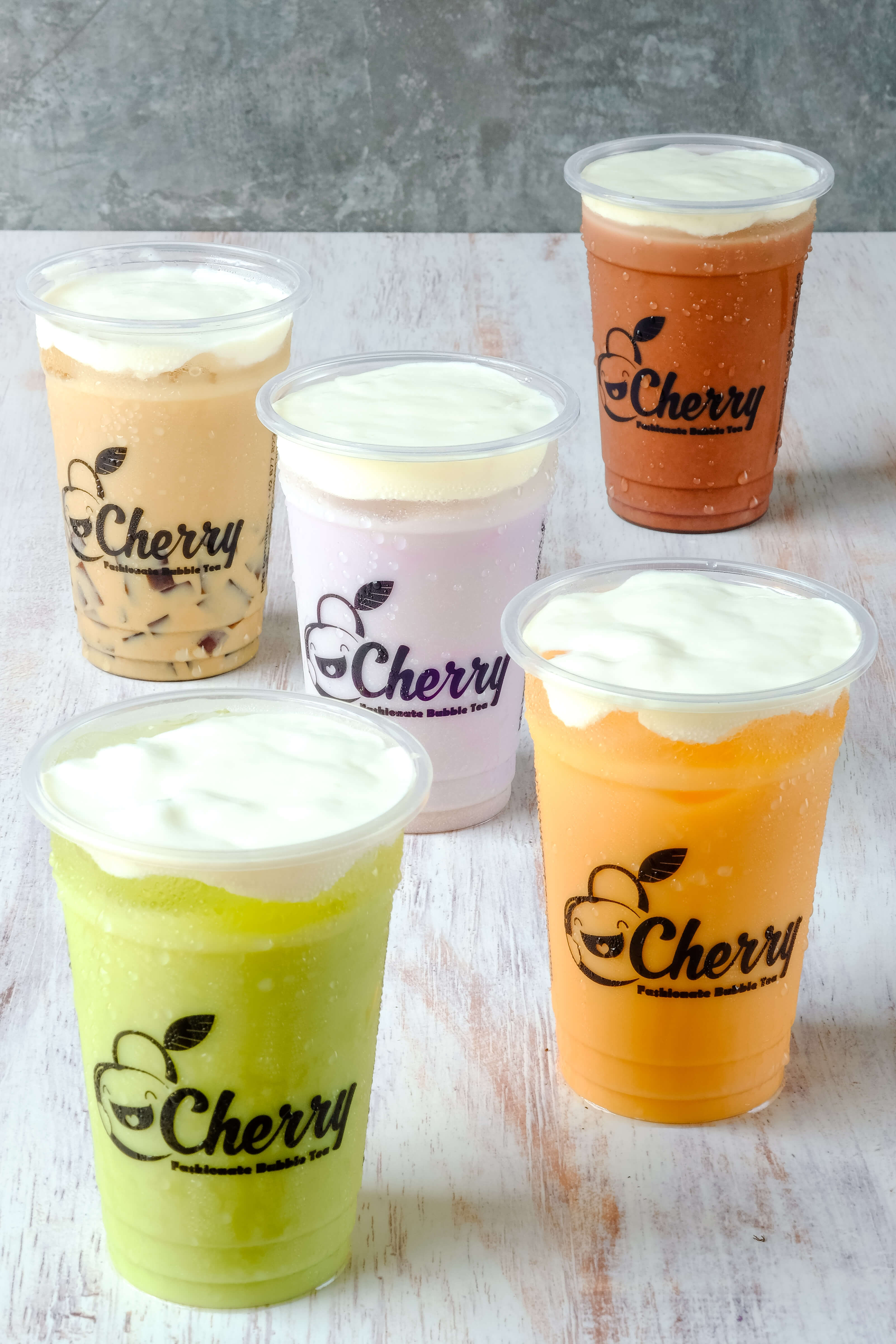 Variant menu minuman dengan cheese foam diatasnya, tersedia rasa Taro, Cappucino, Green Tea, Thai Tea, Signature Chocolatte
