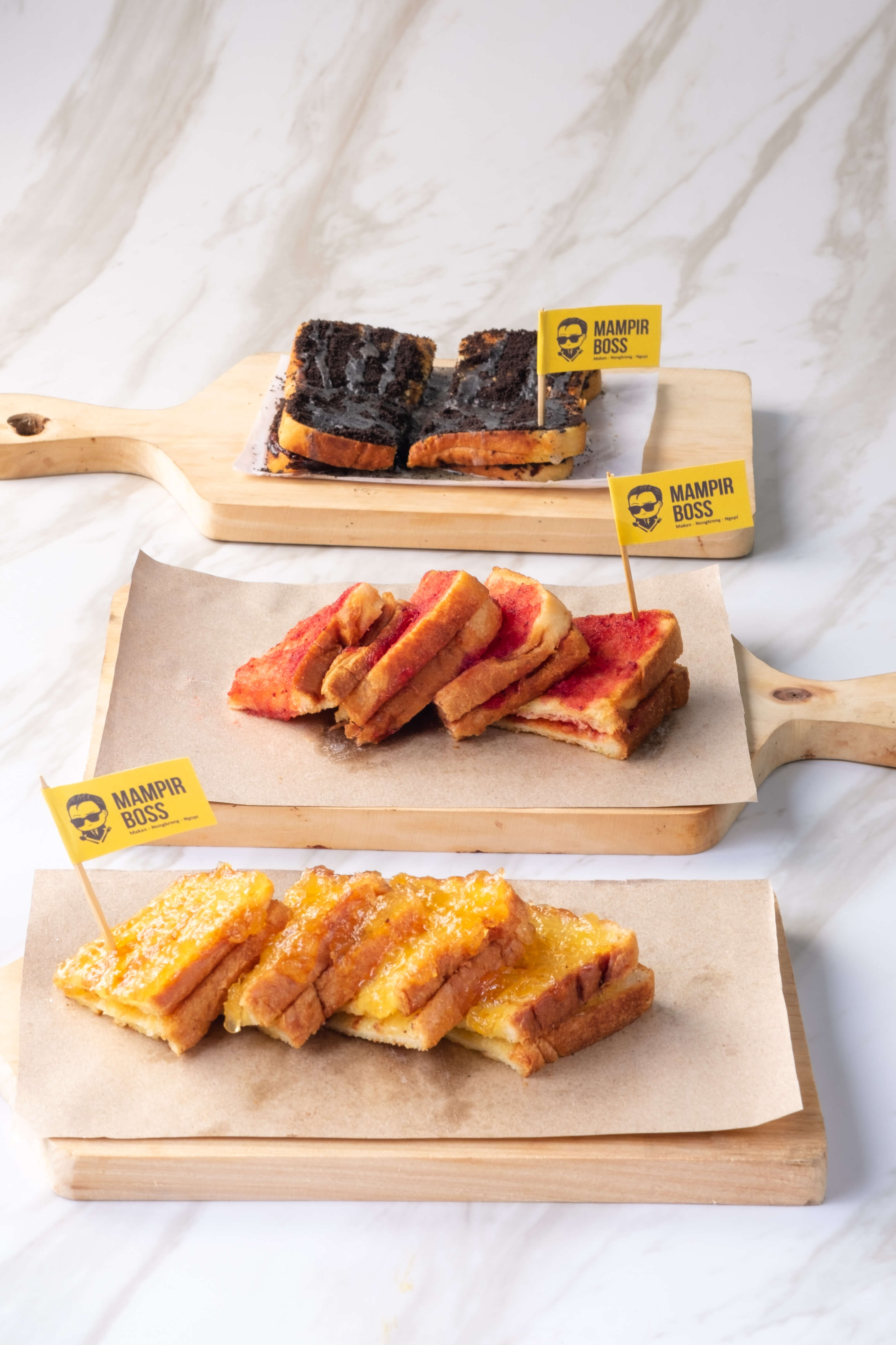 Cemilan teman nongkrong favorit di Mampir Boss, tersedia rasa Susu Coklat, Susu Keju, Coklat Keju, Kacang, Strawberry, Green Tea, Oreo dan Milo